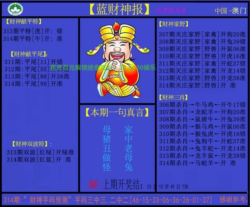 | 314期 | 龙 | 6尾 | 07合 | 羊23 |